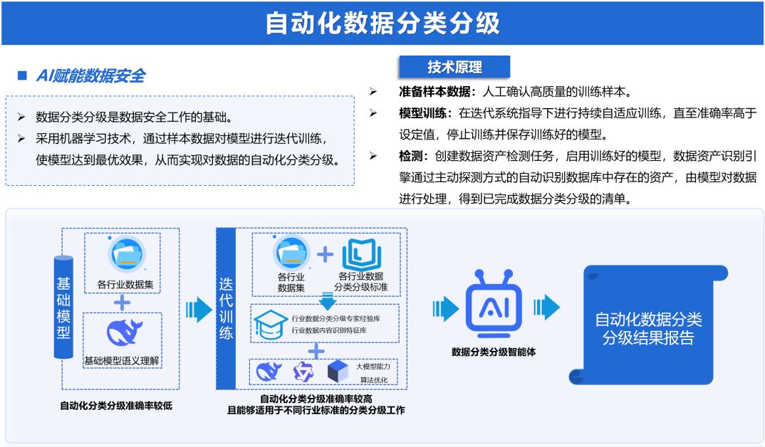 迪普科技AI数据分类分级智能体针对传统人工分类效率低、一致性差的问题,构建了集数据资产探测、AI模型引擎、模型管理与应用于一体的全流程解决方案。通过数据库协议解析与凭证认证,主动发现库表字段等对象并生成资产清单,研发了面向结构化与非结构化数据的智能分类分级技术。