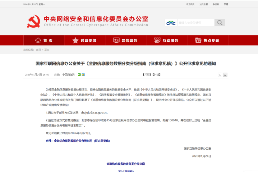 国家互联网信息办公室近日发布了《金融信息服务数据分类分级指南(征求意见稿)》,该指南详细规定了金融信息服务数据的分类方法,包括业务数据、用户数据和企业数据的三级分类,以及核心数据、重要数据、敏感一般数据和常规一般数据的四级分级。此指南旨在规范金融机构的数据处理活动,提升数据安全水平,确保金融信息服务的安全性和合规性。意见反馈截止至2026年2月23日,意味着金融行业数据合规进入“精细化管控”新阶段。